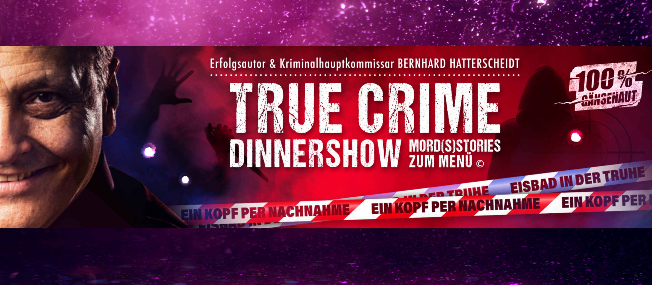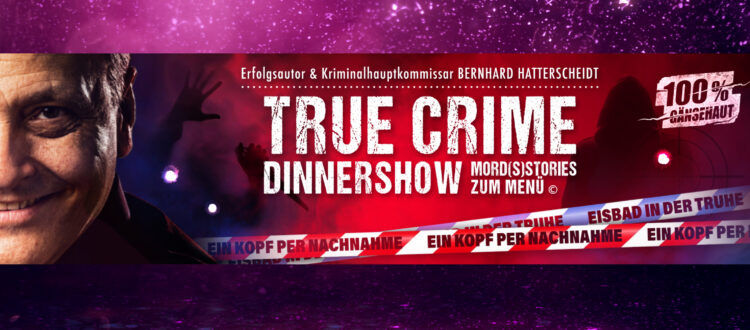 An diesem Abend wird die True Crime Dinnershow “Eisbad in der Truhe” aufgeführt. Ein Handwerker findet eine vereiste Leiche im Keller eines Mietshauses… doch das ist noch nicht alles. Zu Karneval erschießt ein mörderischer Hase einen Imbissgast und in einer heißen Sommernacht macht ein frisch verliebtes junges Paar eine grausame Entdeckung in einem Park. Bernhard Hatterscheidt gewährt tiefgreifende Einblicke in seine Arbeit und offenbart unglaubliche Anekdoten aus dem Alltag seiner Tätigkeit bei der Kriminalpolizei.